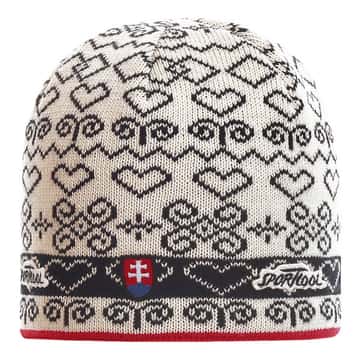 Gorro de malha com um padrão Čičman e uma mancha do brasão de armas eslovaco na testa.